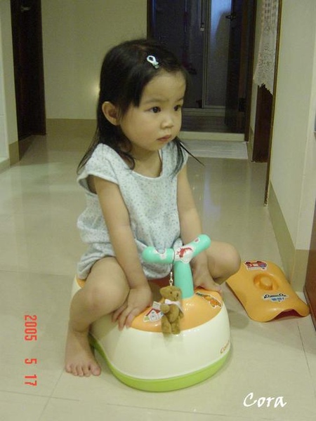 第四天,喝完早餐ㄋㄟㄋㄟ又奮鬥了一陣子,仍不肯坐馬桶,二個小時後,安安姐姐她們來玩,小毛毛終於在小馬桶內一洩千里...嗚...這傢伙,在ㄍㄧㄥ什麼?