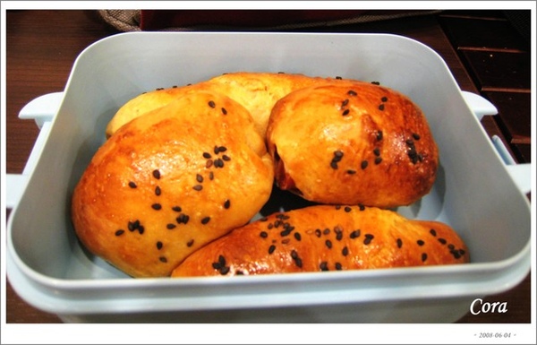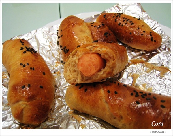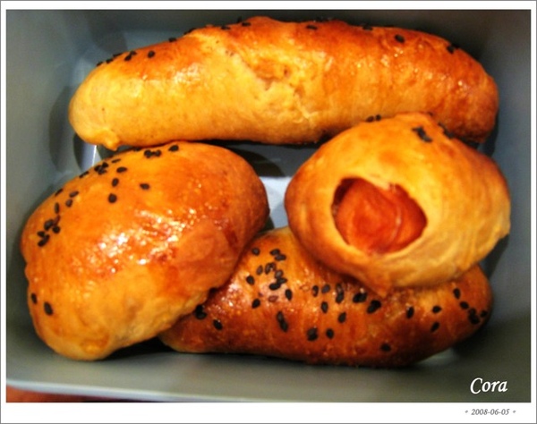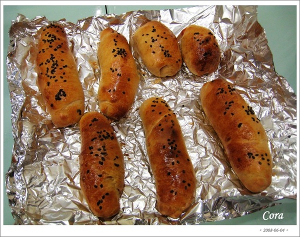 今天的麵團都是小毛毛一個人擀的,最後兩個小熱狗麵包留給毛毛自己捲,想不到毛毛捲的做出來效果最好^^