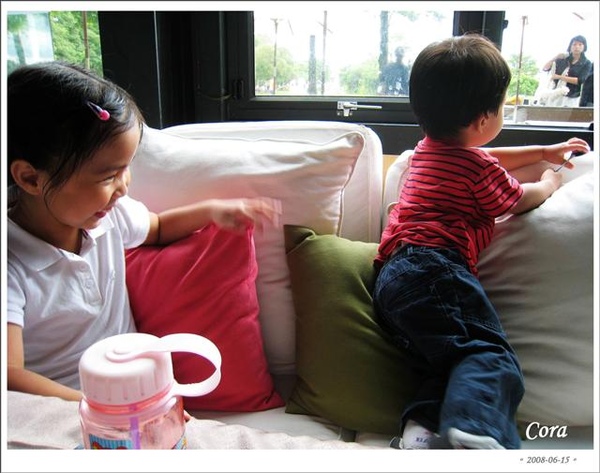 千呼萬喚的,終於喬到我們用餐的位子了,兩個小屁蛋很喜歡沙發的位子,兩個緊挨在一起坐,我和毛拔只能坐對面(通常我們會各分一個小孩坐旁邊好就近照顧)