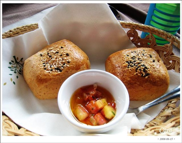 我們各有一份的濃湯和沙拉,兩人份的麵包