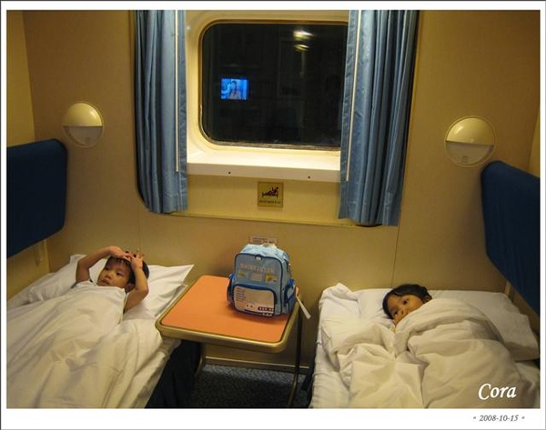 另外擔心小朋友的狀況,還好寬已經睡著了,毛毛在洗頭髮時因受到晃動的關係,哇哇大叫,直到睡覺前還不時的向我抱怨船太晃,