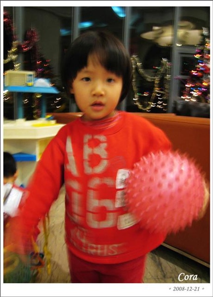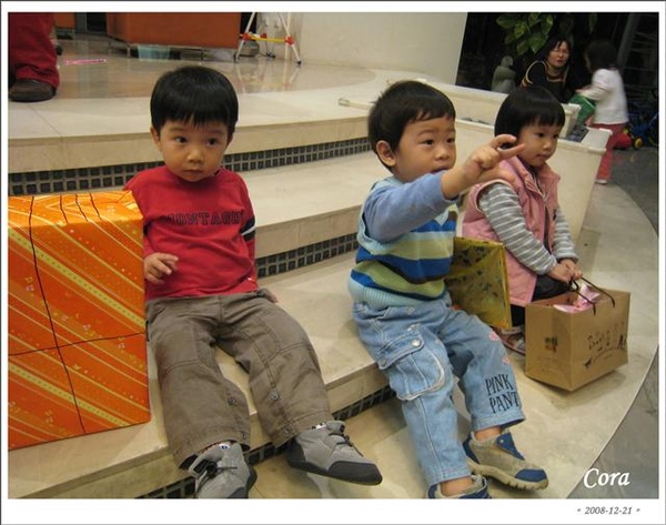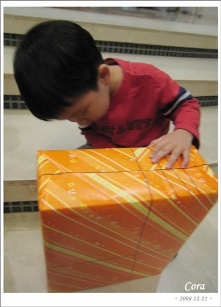 下一個就發到寬寬的禮物了,毛毛發現了,比弟弟還興奮,寬則是完全呆了,最後是用爬的爬上階梯去領他的禮物...冏...