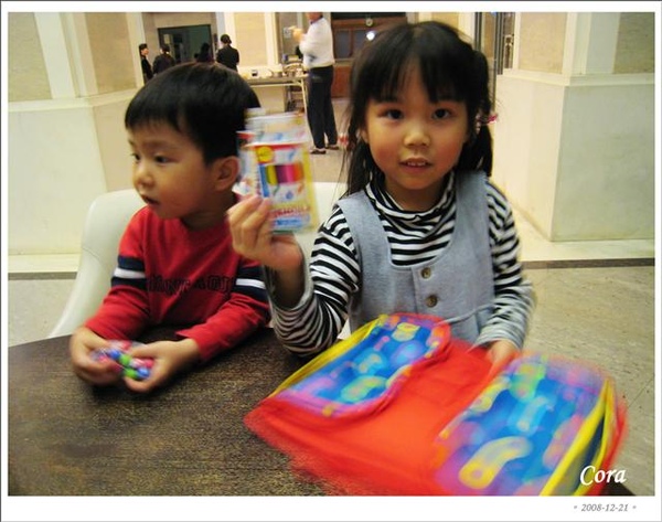 結果沒等念到寬的名字(喂,是阿比弟弟的啦),寬寬搞不清楚的跑去把人家的禮物領走...喬半天弄不回來,兩個呆呆的小孩站在台上...