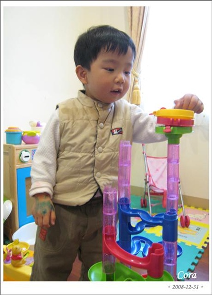到底有多好玩呢?就是一堆零件(軌道)可自行組裝(大人要幫忙,毛毛可以自己組簡單的),寬寬光是把珠珠丟下去跑就很開心了
