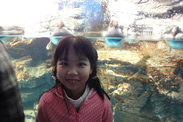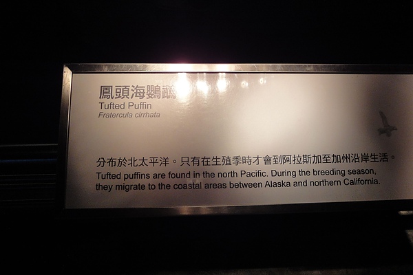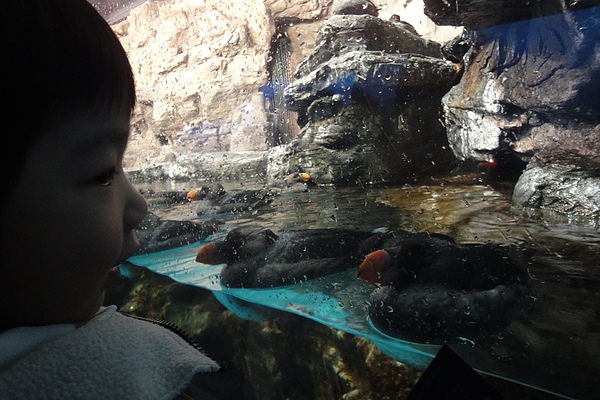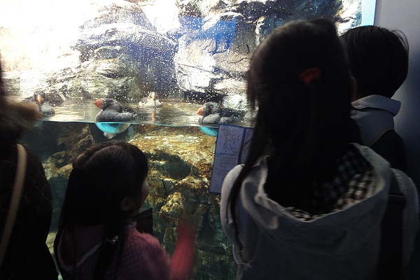 黃小呱學姐姐用館內的簡介單貼在玻璃上吸引puffin的注意,牠們也真的想把紙張啄掉,很好玩