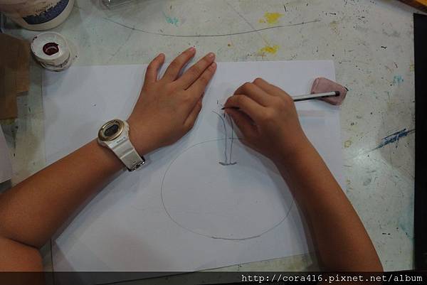南瓜每一瓣的紋路毛毛不是掌握得很好,老師示範了一次,毛毛照著改,有稍微好一點