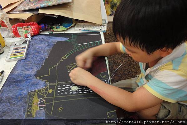 老師給小朋友每人一張黑色的紙,請小朋友先畫出建築物,或馬路,或車子,或燈光