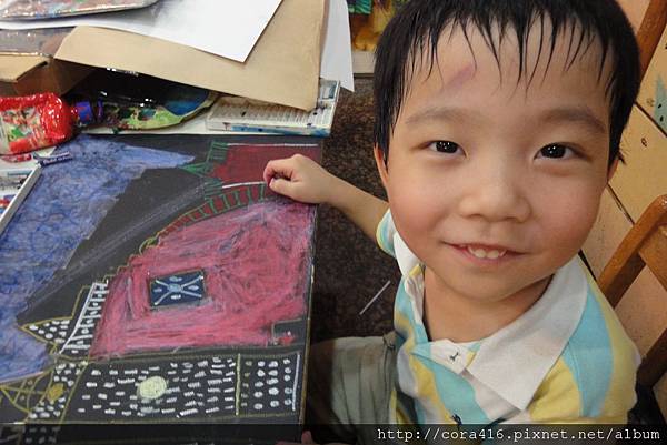 呱呱還在和窗戶奮鬥,他畫的是教堂式的高樓大廈,頂樓還有sogo看板
