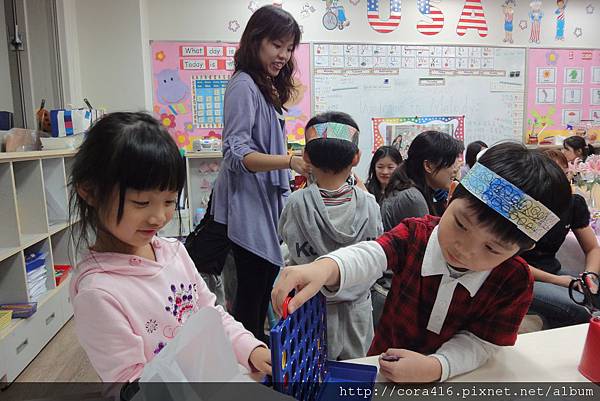 呱呱和同學互看對方取的食物(頭頂的火雞是每位小朋友自己做的喲)
