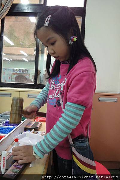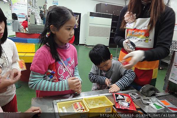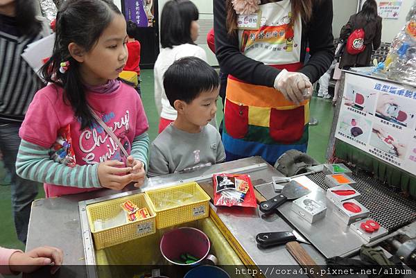 第四站,製做星形蠟筆,小朋友可以自由選擇顏色或混色,最後在大姐姐的指導下踩機器壓模,得到自己的蠟筆