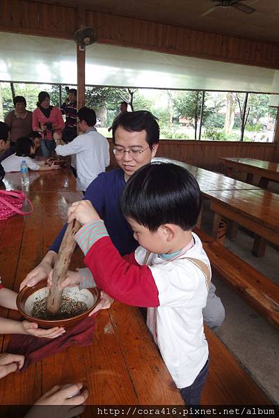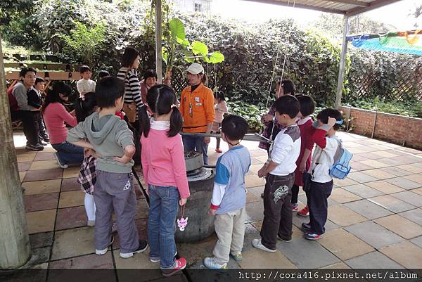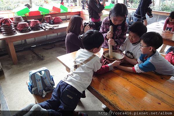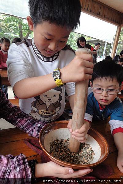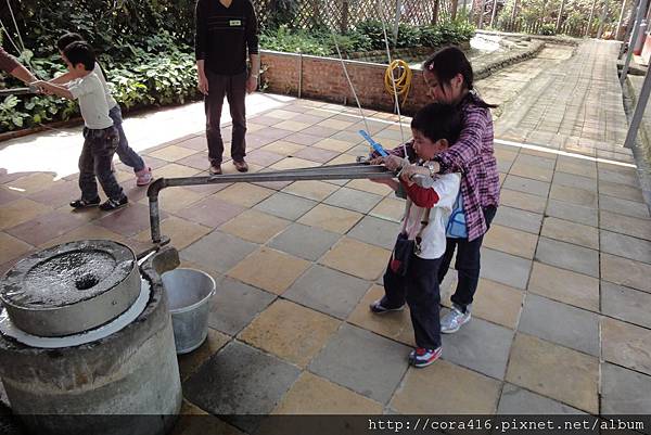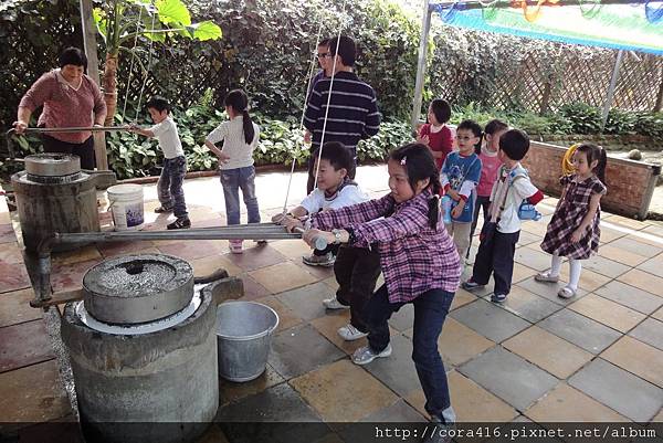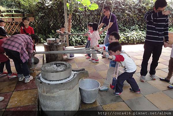 兩個小蘿蔔頭小小的力氣根本推不動,原來碾米漿這麼辛苦,阿姨在旁助一臂之力