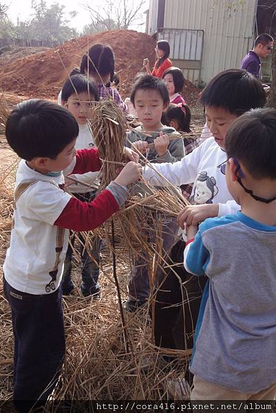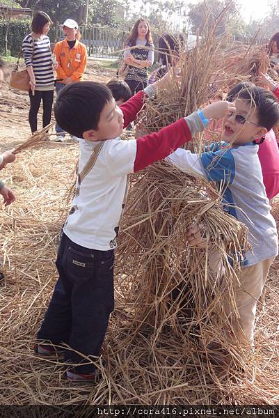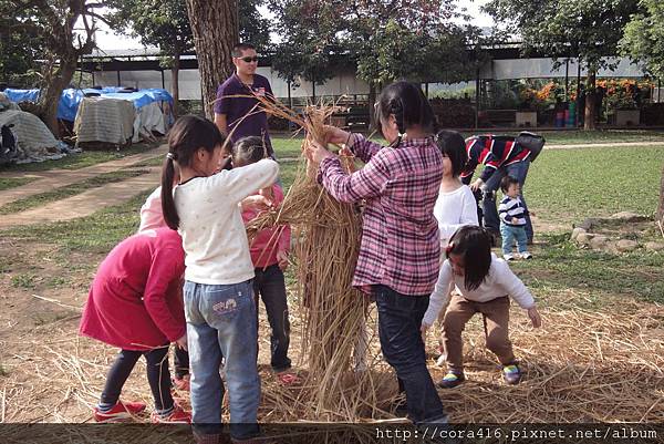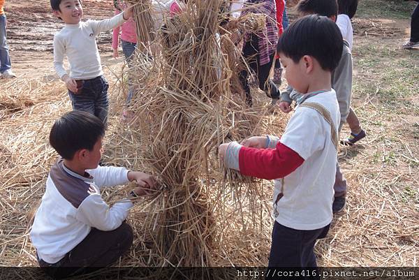 接著,導覽阿姨帶我們去紥稻草人,她先示範,再把小朋友分成兩組PK